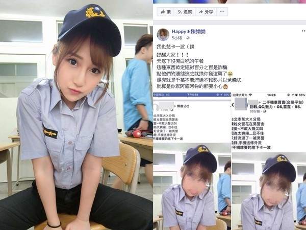 警花影片流出?一名男網友在臉書社團「爆廢公社」PO文說,台北市某女警因男友把手機送修,導致性愛影片外流,並要網友留言「卡」索取影片。豈料,照片當事人女模陳樂樂直接將發文截圖,打臉原PO。