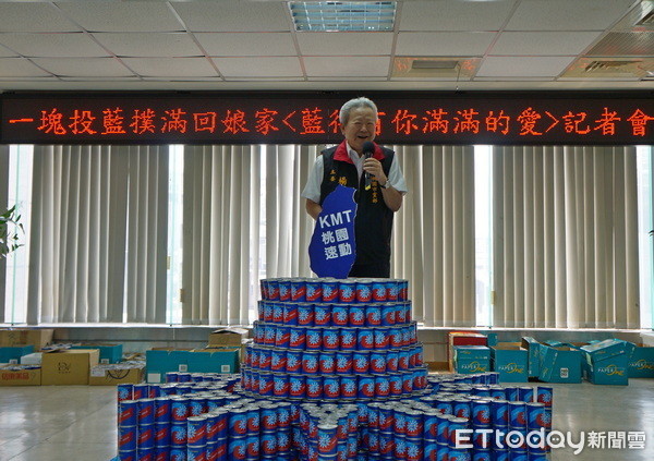 國民黨桃園市黨部舉辦的一塊投藍撲滿回娘家「藍得有你、滿滿的愛」活動,現場最特殊的是,由桃園區黨部花了兩天時間,以近2000個易開罐撲滿,推疊出長、寬各2公尺,高120公分的巨型黨徽,除了象徵接地氣外,上方的台灣地圖也以「KMT桃園速動」為主題,希望「一塊投藍」撲滿回娘家活動,從桃園出發在全國遍地開花。