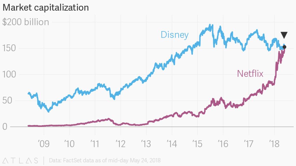 全球兩大媒體公司的市值消長也反映了消費者偏好的改變,比起看電影和看電視的傳統方式,更多人喜歡用網路串流觀看影片,網飛目前在190個國家共有1.25億的串流服務付費訂閱戶,也推出了許多系列原創節目。