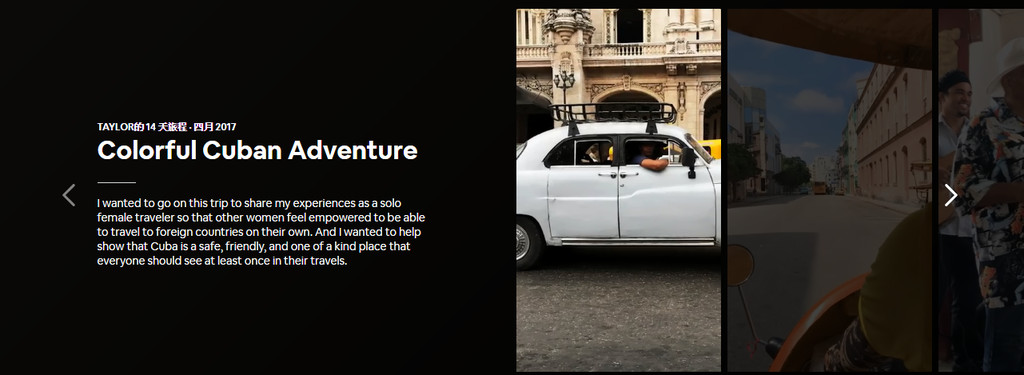例如,上圖為網友 Taylor 前往古巴旅遊所製作的限時動態,一共有 10 張,可以發現就算是靜態圖片,系統也會以慢節奏的投影片模式進行瀏覽,下方推薦連結除了有房間資訊,還包含咖啡廳、酒吧以及其他動態推薦。