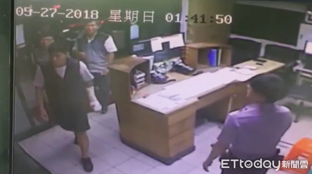 ▲囂張砍人的黑衣人凌晨投案,被帶進派出所。(圖/記者林裕豐翻攝)