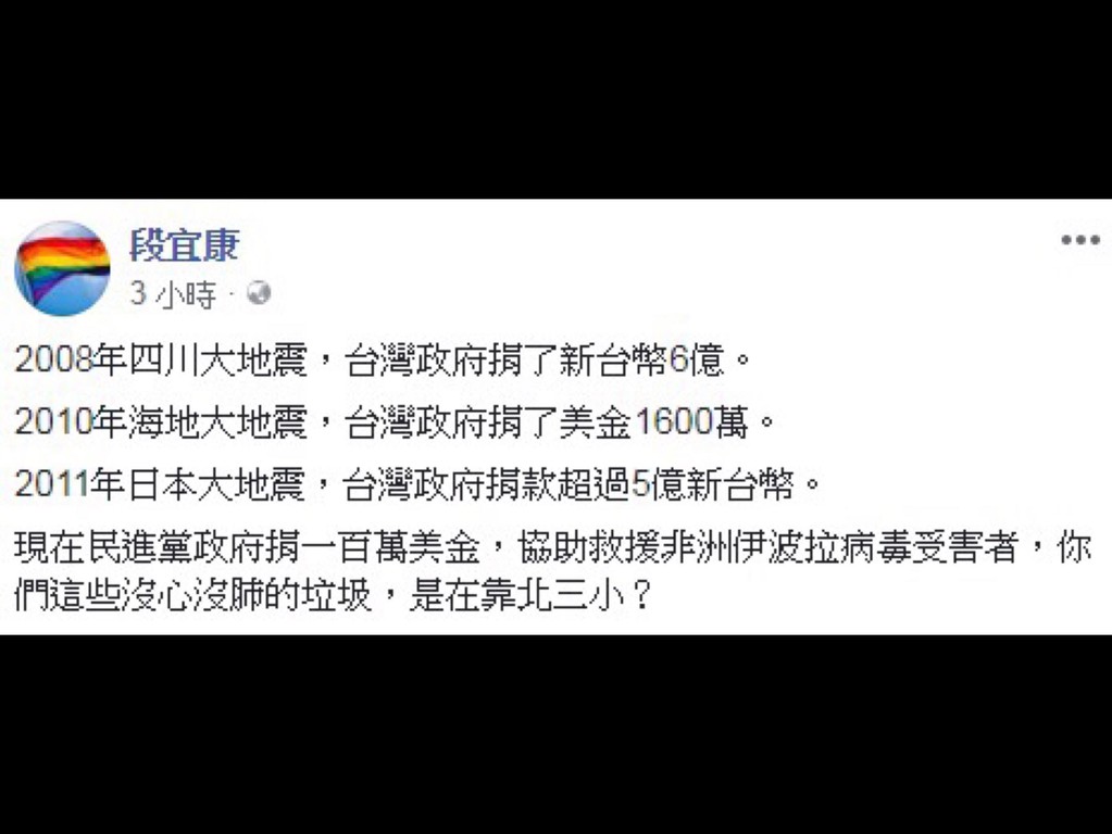 面對批評,段宜康27日也在臉書回擊指出,2008年四川大地震,台灣政府捐了新台幣6億;2010年海地大地震,台灣政府捐了美金1600萬;2011年日本大地震,台灣政府捐款超過5億新台幣。「現在民進黨政府捐一百萬美金,協助救援非洲伊波拉病毒受害者,你們這些沒心沒肺的垃圾,是在靠北三小?」