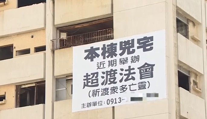 不過最近九龍大樓外卻掛出「本棟凶宅近期舉辦超渡法會,祈渡眾多亡靈」的白布條,再度引起關注,還有人質疑和對面大樓的新建案有關,不過業主蔡先生說,「那棟是久以前發生的事情,跟新建案沒有關係,單純想辦法會,方便以後使用,所有產權整理好辦個隆重法會,就可以整修整理,不然放那麼久了。」