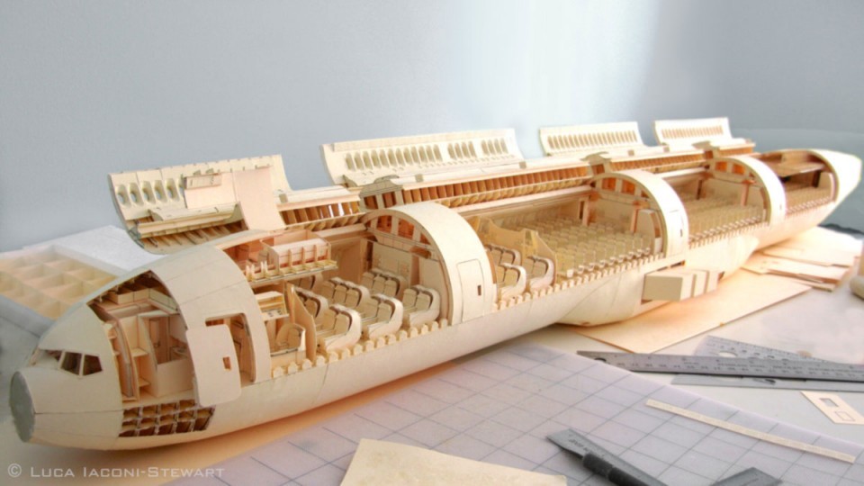 這個驚人的精細藝術品是紐約年輕設計師 Luca Iaconi-Stewart所創作的,這不是他的第一架飛機,而他的紙飛機系列創作以超精細的細節著名。當初 Luca Iaconi-Stewart意外找到印度航空777-300ER的飛機結構圖,突發奇想利用繪圖軟體將結構圖縮小比例,而後就開始他的紙造飛機工程。