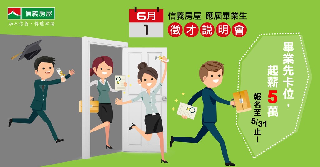 迎接畢業求職旺季,信義房屋將於6/1下午2點舉辦「應屆畢業生徵才說明會」,目標瞄準雙北及桃園地區畢業新鮮人,說明會招募的職位有不動產經紀人員起薪5萬及秘書行政人員起薪3萬,皆優於市場水準;參加者不僅可獲得個人職能分析適性測驗及結果報告外,還可抽最高3萬元的海外旅遊金,讓應屆新鮮人畢業後先出國玩,回來再上工。