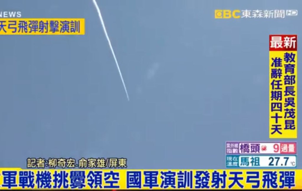 國防部為了對應中國解放軍戰機、船艦繞台情形,決定在漢光34號演習期間,選在屏東九鵬基地進行飛彈射擊演練,29日也先模擬了解放軍轟六攻台,國軍試射天弓一型飛彈予以攔截。但卻有一名大陸網友分析試射畫面後,笑說「沒攔截到目標彈脫靶,脫靶!」還分享對照影片引發討論,但影片無法完全證實天弓一型飛彈是否真的脫靶。