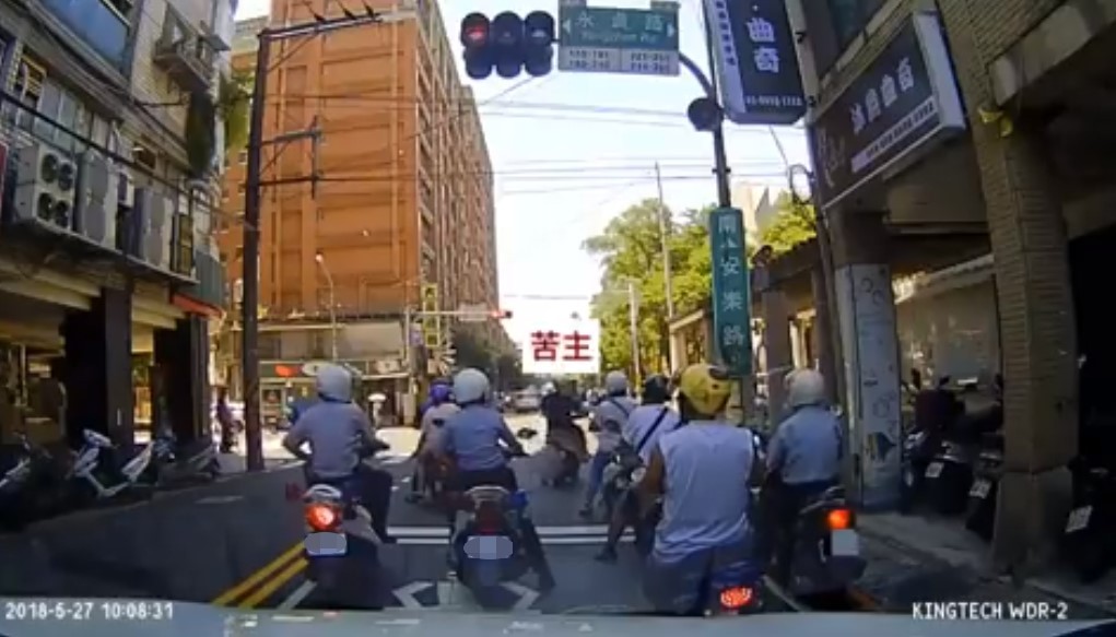 ▲停在前方的騎士沒有發現後面有兩名警員。(圖/翻攝自爆料公社,下同)