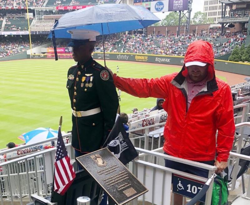 亞特蘭大勇士隊在推特上寫上「尊敬」(Respect),而照片中可以看到一名非洲裔美國海軍陸戰隊「青少年儲備軍官訓練團」的少年,在大雨中站在「紀念椅」旁,而這名少年的身後則有一名穿著紅色夾克、留著鬍子的男子,則為他撐著傘。