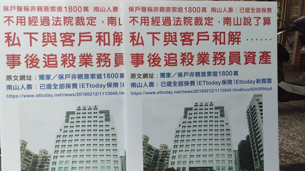 《ETtoday新聞雲》今年2月獨家披露南山人壽以保戶主張被保險人非親簽及業務員招攬不實,同意解約並退還1800萬元保費一案,由於業務員至今延遲數月還未領到34萬元公積金,工會將聲援該員發起抗爭,並協助對南山及保戶提出告訴自清自救。