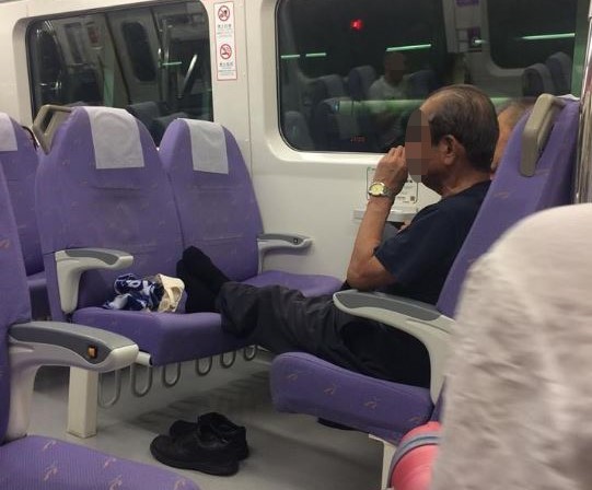 ▲阿伯將穿著襪子的雙腳抬高靠在對面的座椅上。(圖/翻攝自爆料公社)