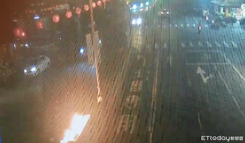 警方說,永康區中華路與大橋二街口,31日凌晨0時1分許發生一起機車與自小客車相撞車禍,丁姓女子(22歲)駕駛重機車,由中華路北往南行駛至大橋二街,迴轉至中華路南往北,與27歲沈姓男子駕駛之自小客車發生碰撞,因機車傾倒後汽油洩露地面及摩擦地面產生火花後燃燒,從監視器影向來看,地面宛如畫出一條火龍,相當驚悚,所幸未波及肇事車輛。