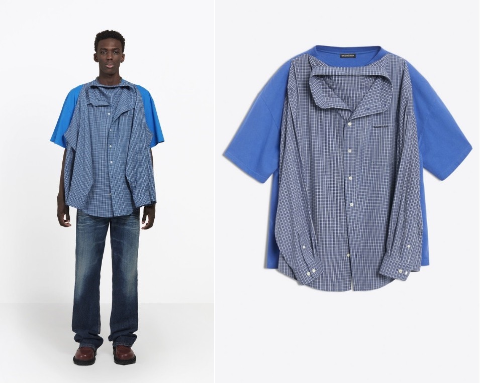 這款「T恤襯衫」(T-shirt shirt)要價不斐,定價1290美元(約台幣3萬8613元),但整體看起來就是在一件短袖T恤前面縫上格子襯衫。據Balenciaga網站稱,這件衣服有兩種穿法,消費者可以隨意願選擇穿著T恤或襯衫,剩下的那一件就會垂掛在前胸或背上,形成「垂褶效果」。
