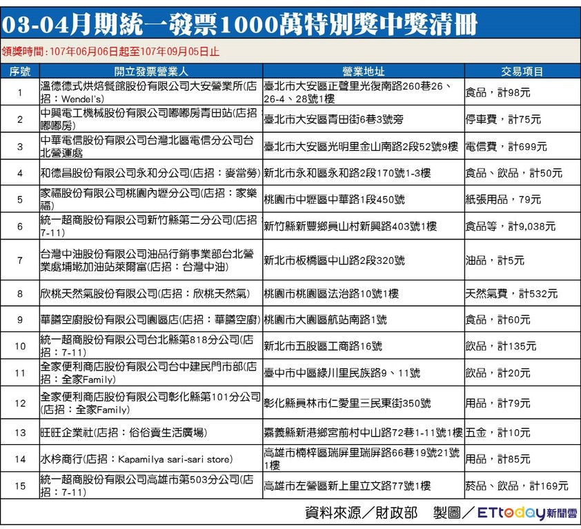 另外,新北市也開出3張特別獎,包括在板橋中山路中油幫機油加油,扣紅利卡45元,實際只花「最低金額5元」就抱走1000萬元大獎;還有人在五股工商路的統一超商買135元飲品、以及永和永和路上麥當勞買食品、飲料50元幸運中獎。