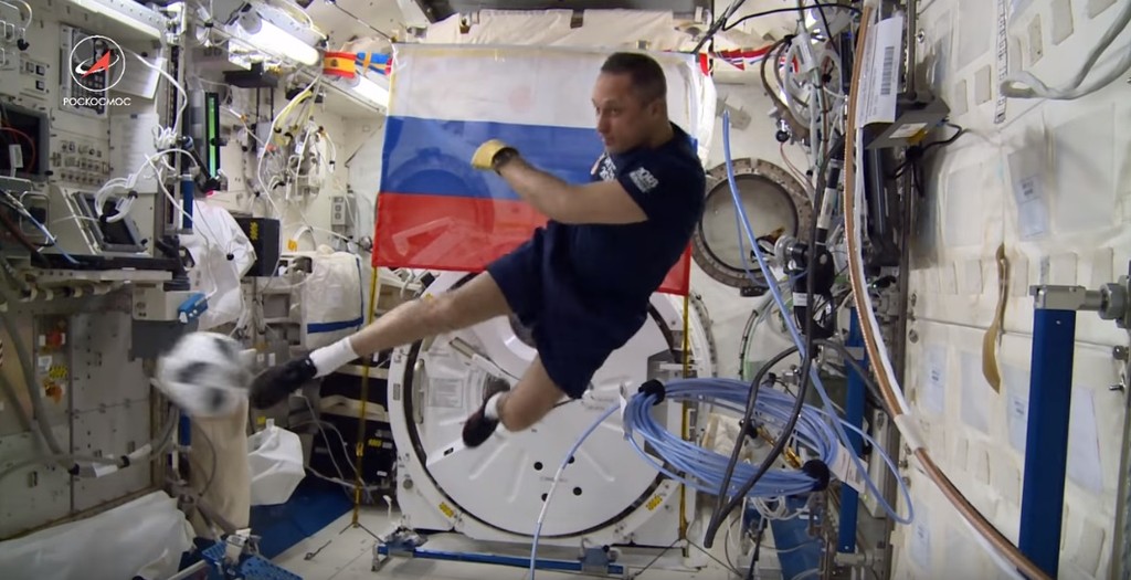 作為世界盃足球賽的東道主,俄羅斯也在國際太空站(ISS)上以另類方式慶祝世界盃的到來。俄羅斯太空總署(Roscosmos)昨(31)日發布的影片中,太空人阿騰葉夫(Oleg Artemyev)和希卡普羅夫(Anton Shkaplerov)為迎接即將到來的世界盃,身穿2018俄羅斯世界盃官方T恤和黃色手套,艙頂掛上大面俄羅斯國旗和其他國家的小國旗,在無重力的環境下來回踢球。
