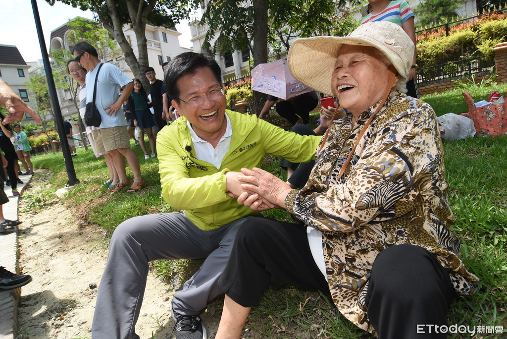 ▲台中市長林佳龍看到民眾坐在草地上,親自陪坐聊天,聽到讚美十分開心。(圖/記者李忠憲攝)