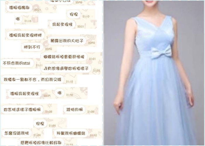 新娘在「爆怨公社」發文寫道,「第一次抱怨請不要認親,目前玻璃心到最底層,雖然起初只讓3位伴娘挑,沒讓妳和其他2位挑到,雖然禮服真的不是那麼完美,但總歸這是我的心意,想送伴娘們的紀念,禮服是公版,不是量身訂做。」