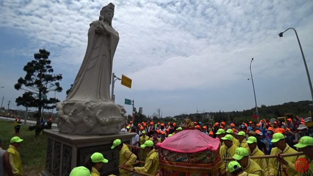 ▲白沙屯拱天宮三媽巡行賜福,卻直衝三角公園一處媽祖石雕。(圖/白沙屯媽祖網路電視台YouTube,以下皆同)