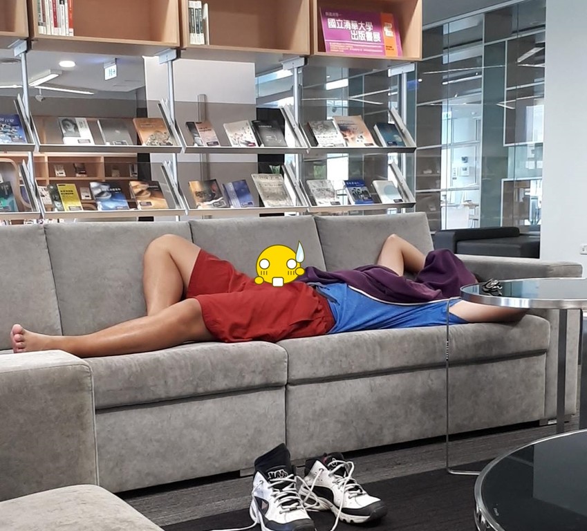 ▲男躺在清大圖書館沙發呼呼大睡。(圖/翻攝靠北清大)