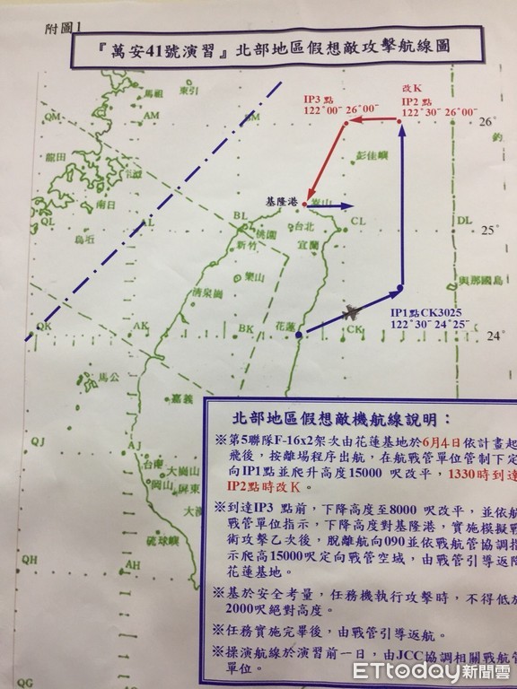記者會對外說明,這架6685號戰機執行萬安41號演習假想敵攻擊基隆港的演習,在4日下午1時15分起飛,依據航線從花蓮機場起飛後,爬升到1萬5000呎往北飛行,在1時30分,約在彭佳嶼北方轉彎開始下降高度,執行定向攻擊目標基隆港,曾在目標前14浬回報進入雲層,隨即於1時44分光點消失在基隆五分山。