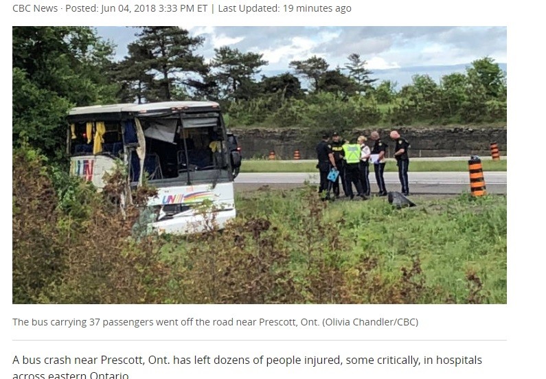 根據加拿大CBC報導,一輛載有中國遊客的巴士,4日下午行駛於普雷斯科特(Prescott)的401高速公路上,突然失控衝出馬路外,並且猛撞上路邊石縫。這輛巴士包含司機與導遊共37人,準備從渥太華(Ottawa)前往多倫多(Toronto)的陸上。