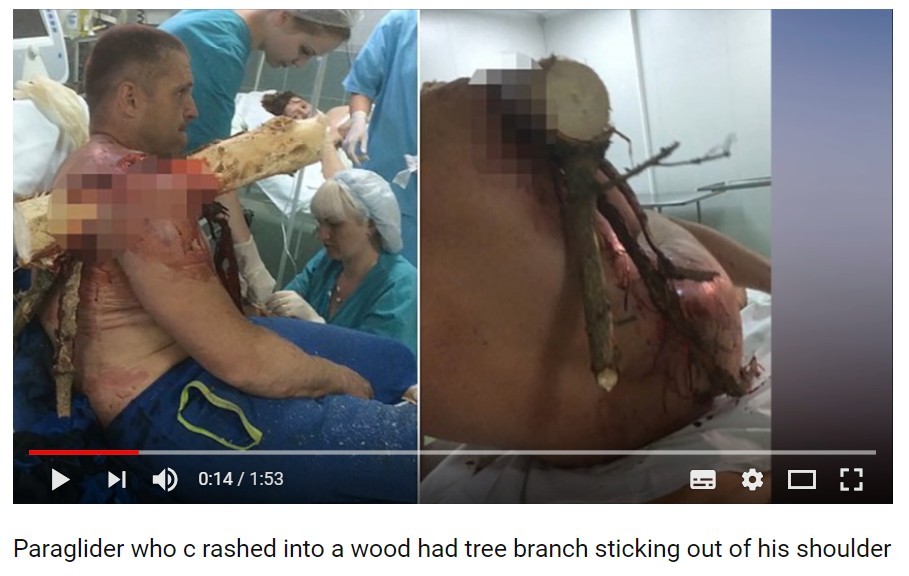 俄羅斯一名男子玩滑翔翼時發生意外,他飛到一處森林時,束帶突然斷開,導致整個人從高空墜落,更慘的是,當他想起身時,才發現自己的肩膀被一根粗大的樹幹貫穿,當場血流不止。