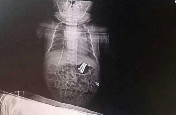 年紀尚小的哥哥還不知道事情的嚴重性,馬上回答餵了3根螺絲釘。阿楠一聽立即帶著小兒子衝到醫院掛急診,直到當天下午4點多才轉診到河南省兒童醫院消化科進行治療,醫生檢查發現這3根長3.5公分的螺絲釘還留在胃裡,可以先用胃鏡試試看,如果不行就只能動手術取出。