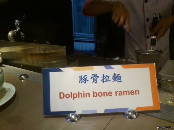 屏東墾丁一家五星級飯店餐廳23日早餐提供豚骨拉麵讓旅客食用,卻被眼尖的台灣旅客發現英文翻譯寫成「Dolphin bone ramen」(意為海豚骨頭拉麵),他把照片PO上網,開玩笑說:「夭壽!我吃了保育類動物骨頭做的拉麵。」飯店在24日緊急更正,表示未來會更注意食物名稱的翻譯。