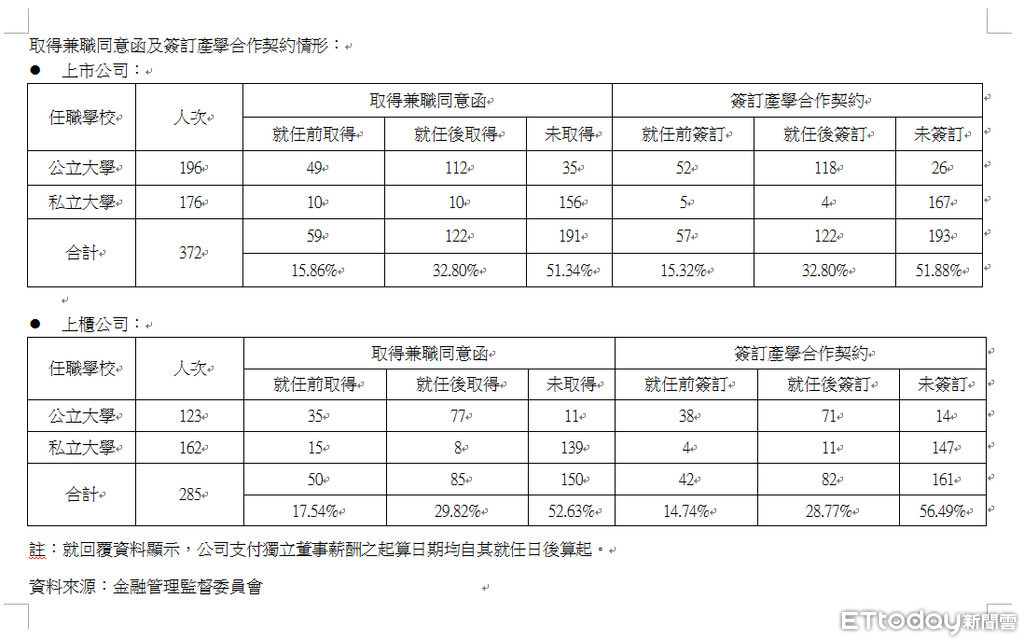 另外,於上櫃公司兼任獨立董事之具大專院校專任教師身分者有285位,其中29.82%於就任後取得兼職同意函,高達52.63%未取得;就任後簽訂產學合作契約者佔28.77%,未簽訂者達56.49%。
