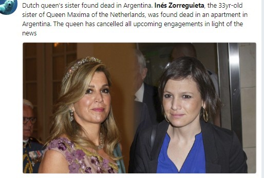 荷蘭王后麥西瑪(Maxima Zorreguieta)的親妹妹伊內斯(Ines Zorreguieta)驚傳自殺身亡,享年33歲!荷蘭王室當地時間周四出面證實死訊,表示王后非常悲痛,已取消下周所有出訪行程。