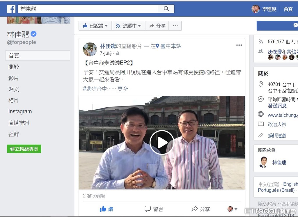 台中市長林佳龍今天早上7點開啟臉書直播,用20多分鐘的時間與交通局長王義川、台中火車站站長葉仁和現場勘察動線,藉此讓民眾對車站動線有進一步了解。影片獲上千人按讚,2萬人次觀看,更有114人分享。