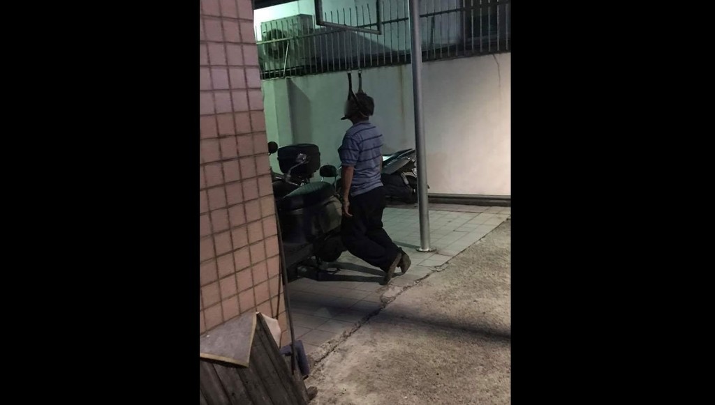 嚇到尿閃出好幾滴!一名網友在臉書爆廢公社PO文,7日晚間騎著機車回家,才剛停好車就瞄到停車場內似乎有人影,走近一看赫然發現一位阿伯雙膝微蹲吊在半空中,嚇得原PO直呼「要做復健不能在家裡做嗎?非得在外面這樣子吊著!」
