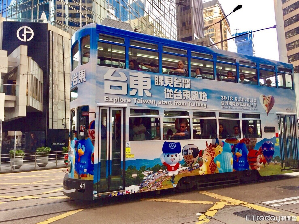 ▲台東連續第三年在香港街頭以叮叮車宣傳台東之美,今年以著名的地標三仙台日出及鹿野高台熱鬧繽紛的熱氣球穿梭於香港最熱鬧的街頭。(圖/台東縣政府提供,下同)