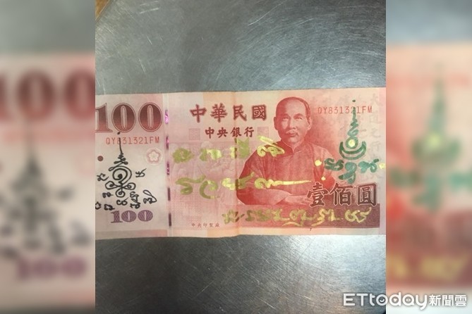 「感覺有點恐怖」該名男網友在臉書社團「爆廢公社」發文表示,從事小吃店的他日前從客人那邊收到一張百元鈔票,上面莫名的文字及圖案讓他非常害怕。