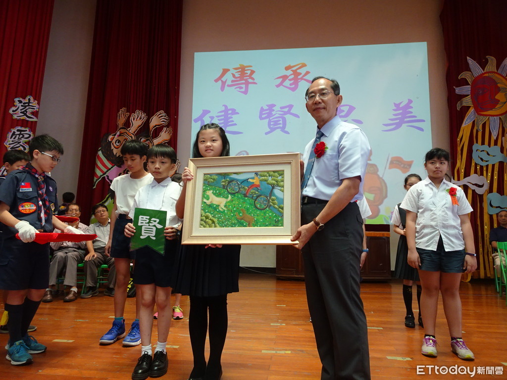 ▲台南市永福國小 周佑庭同學捐出多年來的零用 錢,購買由總統教育獎得主李佳鎂創辦的「小光點身障藝廊」的義賣畫作, 給校方做為美學教育的布置與 「公益永福」的精神傳承。(圖/永福國小提供)