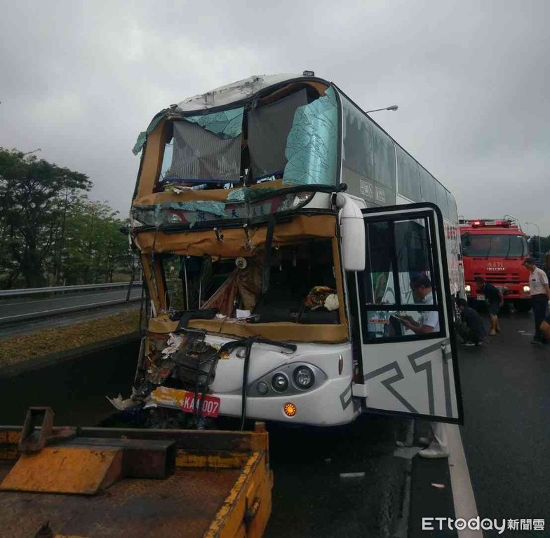 國道警察局第4大隊員警調查指出,上午8時45分在國道一號南向311.3公里處,由鄧姓男子駕駛的大客車,疑似因下雨視線不良,且未保持安全距離追撞前方由許姓男子所駕大自貨車,大客車車內含駕駛共14人,經查證該遊覽車上除導遊1人左腳部骨折,其餘乘客10人送醫,均無生命危險,雙方駕駛人酒測值為0MG/L,全案由國道警察局第4大隊新營分隊處理中。