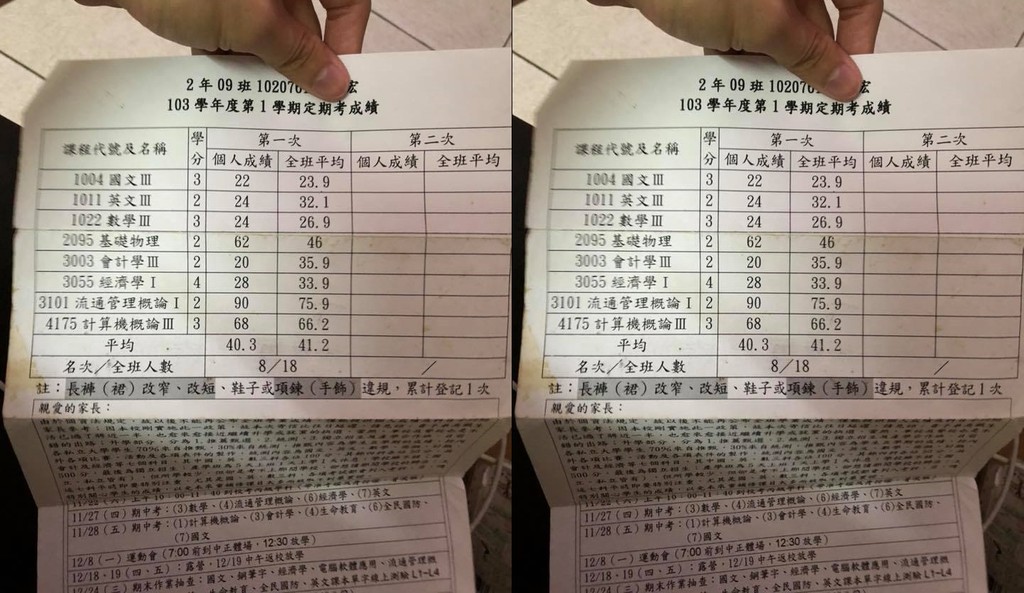 穿著制服的學生時代,是許多人心中最美好的一段記憶,青春無敵的打鬧歲月,最大的煩惱莫過於課業和考試了。就有男網友翻到一張高職二年級的成績單,第一次定期考8科,他僅有3科及格,平均分數40.3分,比全班平均還低,不過拿下了班排第8名,看上去還不錯,卻意外引來論戰。