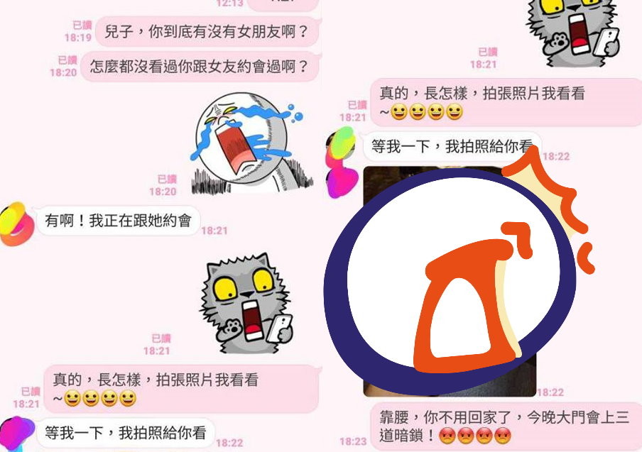 根據媽媽和兒子的對話截圖,媽媽問,怎沒看過你和女友約會,見兒子回「有啊,我正在跟她約會」,她說「真的,長怎樣,拍張照我看看。」兒子說「等我一下,我拍照給你看」,接著傳一張左手掌的照片。媽媽看了傻眼回,「靠腰,你不用回家了,今晚大門會上三道暗鎖。