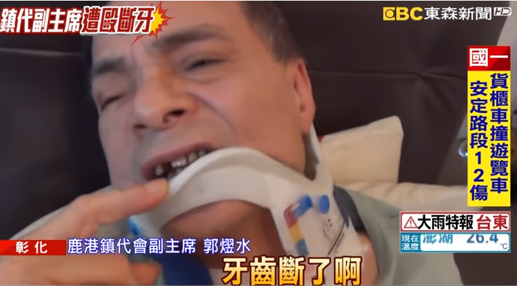 彰化縣65歲鹿港鎮代表會副主席郭熤水9日晚間參加宮廟活動跑攤,結果敬酒到第3桌遭到許姓等6、7名惡煞圍毆,1顆門牙因此被打斷,臉部多處挫傷,經鹿港基督教醫院醫院治療後,還得帶著護頸才行。警方傳訊許姓、林姓以及蕭姓3人,訊後依傷害、恐嚇罪嫌移送法辦。