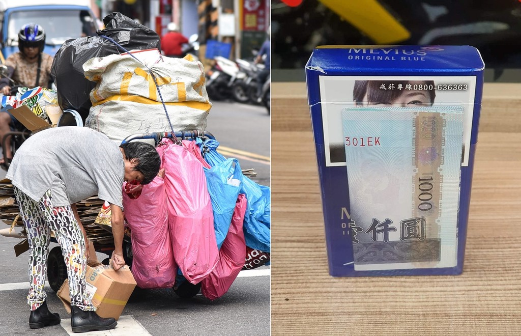 一名男網友在臉書「爆廢公社二館」PO文說,9日在土城超商領貨出來後,就隨手亂丟手上的菸盒,騎機車回家途中突然想到那盒子裡有一張1000元紙鈔,趕緊在飆車回來,卻看見一名拾荒老人揹著孩子正好撿起他丟失的菸盒,「我叫住她說『阿婆裡面有一千塊』,她很疑惑看著我說『剛五?』(台語:有嗎?),我指著菸盒背面說『哩跨!』(台語:妳看!)」