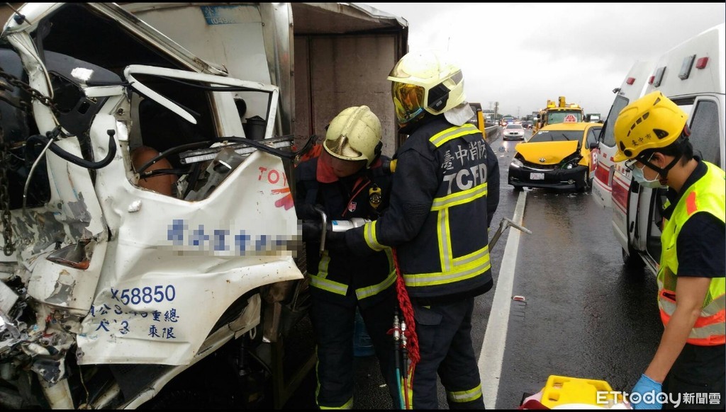 台中市消防局指出,第三救災救護大隊溪湳分隊接獲通報後,趕抵現場,現場為4輛車相互追撞,其中一輛小貨車的車頭受到擠壓,男駕駛遭車頭夾住無法脫困,經評估車體四周環境之後,以移動式油壓破壞器材將駕駛座撐出空間,讓受困駕駛雙腳能夠脫困。