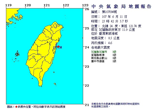 中央氣象局表示,11日晚間11點42分發生芮氏規模4.6地震,深度8.5公里,震央位置在花蓮縣政府東方11.9公里(位於台灣東部海域),各地最大震度花蓮市3級、宜蘭南澳、南投縣合歡山、台中市德基1級。
