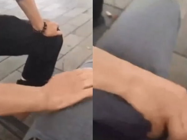 根據小鮮肉拍的影片,穿白襯衫、黑西裝褲的中年男子右腳跨在長椅上,先叫了他一聲「小可愛」,接著用右手摸他的左大腿,並一把握住他的下體,讓形狀都跑出來,嚇得對方雙腳離地。