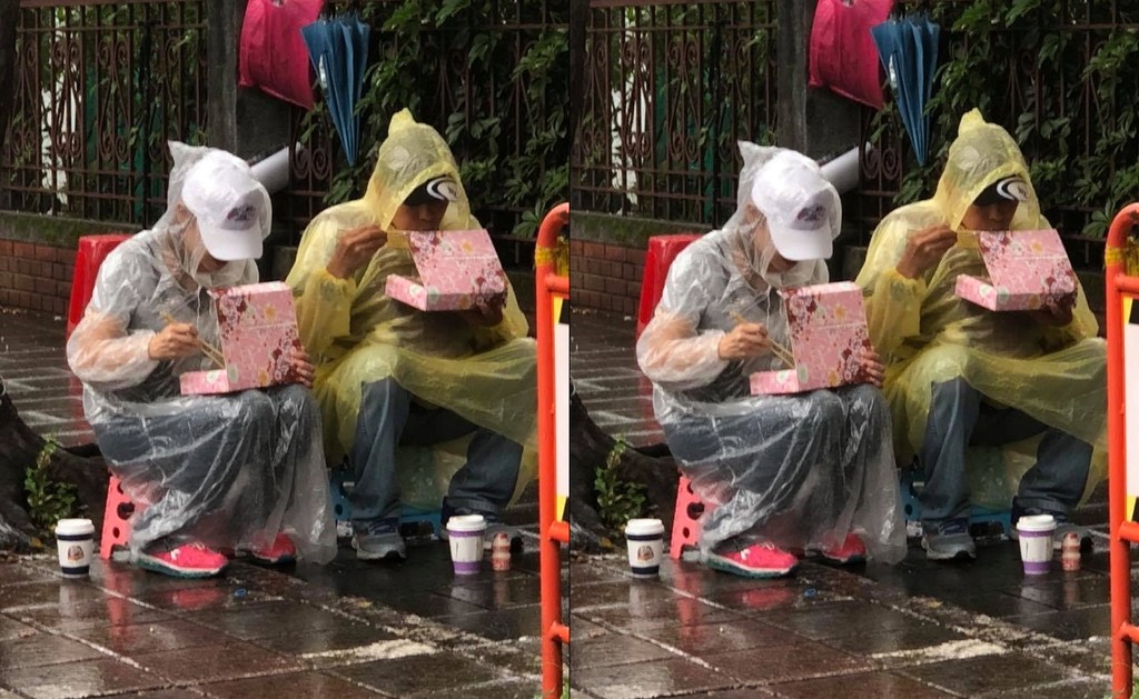 臉書粉絲專頁「八百壯士捍衛權益」11日中午12點5分發照片,當時台北正下著大雨,圖中2位陳抗夫妻換上雨衣,一黃、一白抵禦雨水,他們坐在折疊椅上,低著頭吃起便當,腳邊放著超商咖啡和養樂多,畫面令人不捨,有支持者已分不清眼前是雨還是淚。