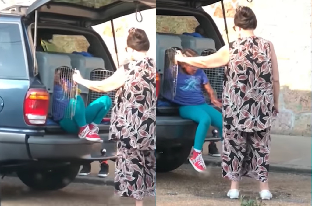 ▲美國奶奶大熱天把孫子關在後車廂狗籠。(圖/翻攝YouTube)