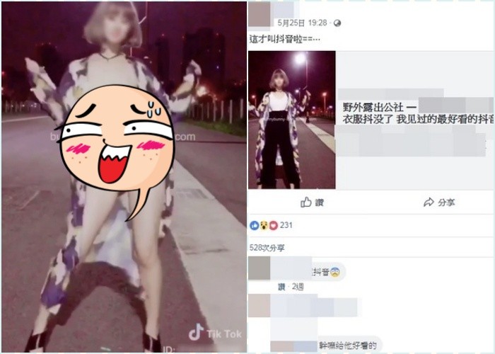 台北市一位女孩喜歡在時下流行「抖音」、「TUMBLR」等平台,低調地分享自己的「野外露出」影片,她的大放送也引來許多網友默默關注,不過最近卻被網友轉PO到臉書曝光,引起許多網友卡位「果然老司機~」,不過也讓不想引起麻煩的女主角氣說「不想被轉到FB的文,恭喜你這篇是你FB最多讚的一篇,相對的你資料也被發到原po,有50多萬粉絲的帳號」。