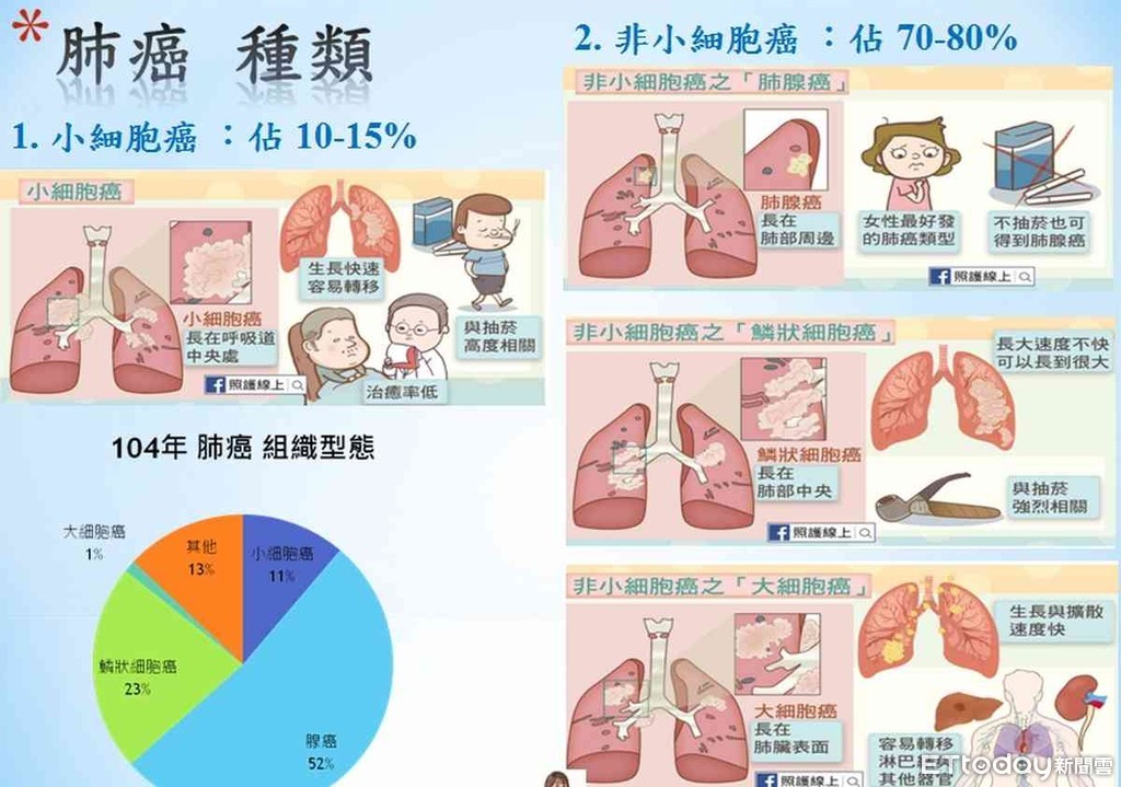 肺癌的種類可分為小細胞癌與非小細胞癌兩大類,前者約占10至15%,好發在呼吸道中央,生長快速易轉移,治癒率低,與抽菸高度相關;後者又可分為肺腺癌、鱗狀細胞癌及大細胞癌。其中肺腺癌佔多數,好發在肺部周邊,是女性最好發的類型;鱗狀細胞癌好發肺部中央,生長速度不快,與抽菸強烈相關;大細胞癌罕見,好發在肺臟表面,生長快速易轉移。