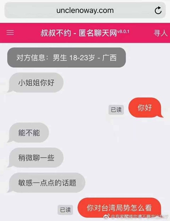 網友在臉書分享一張匿名聊天室的截圖,只見聊天室中是一位來自廣西、18-23歲的男網友,另一位則是身分不明的人。2人直接簡單寒暄後,廣西男直接切入重點話題「能不能稍微聊一天敏感一點點的話題」。