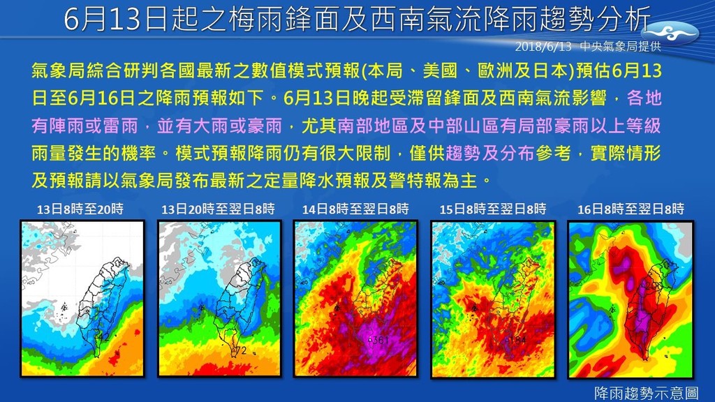 中央氣象局昨(13日)提到,此次的預報,是依據各國的最新數值模式預報,預報降雨仍有很大限制,僅供趨勢及分布參考。實際情況仍以氣象局發布的最新定量降水預報和警特報為主。中央氣象局預報員張心華表示,其實今(14日)凌晨2點有個熱低壓形成,它也明顯造成水氣下半天開始,雨勢會往北移,加上熱帶性低氣壓的靠近,南投、雲嘉以南和台東等地都會有明顯雨勢,其他地方則是有短暫降雨的形態。