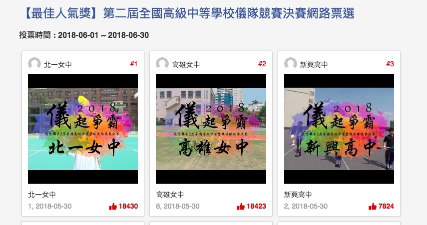 第二屆全國高級中等學校儀隊競賽決賽將在7月7日登場,國防部則提前在6月辦理網路票選活動。其中,在最佳人氣獎部分,投票一開始就上演「南北爭霸」,由高雄女中、北一女中輪流佔領一、二名,戰況相當激烈;而消息一出也引發雙方家長積極拉票,14日下午兩校甚至一度僅有7票之差,分別由北一女獲得1萬8430票、雄女獲得1萬8423票。