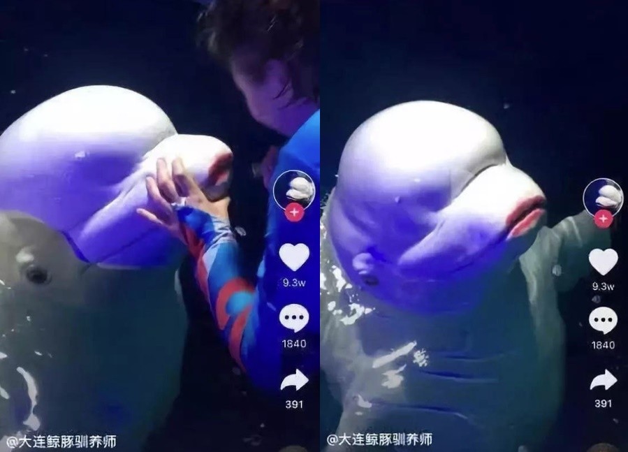 綜合中媒報導,一名自稱是大連鯨豚訓養師的女子近日在抖音上傳一段影片,影片中她竟然在白鯨嘴上塗上大紅色的口紅,為了在白鯨嘴上塗上口紅,更緊緊的抓住白鯨的上下顎,引發輿論譁然。影片上傳後,隨即引來大批網友撻伐,雖然影片馬上被刪除,但早已有許多網友截圖存證。